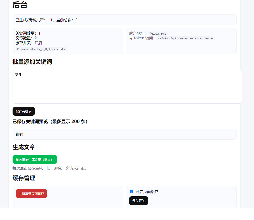 http://后台/admin.php?token=change-me-please部分繁殖方式展示:动态寄生虫【随机】繁殖方式展示http://繁殖地址/index.php?XTJb/8TmiFe.htmlhttp://繁殖地址/index.php?RQxn/Nub6dx.htmlhttp://繁殖地址/index.php?7lZr/cIqPWA.html动态寄生虫【数字】繁殖方式展示http://繁殖地址/index.php?000001.htmlhttp://繁殖地址/index.php?